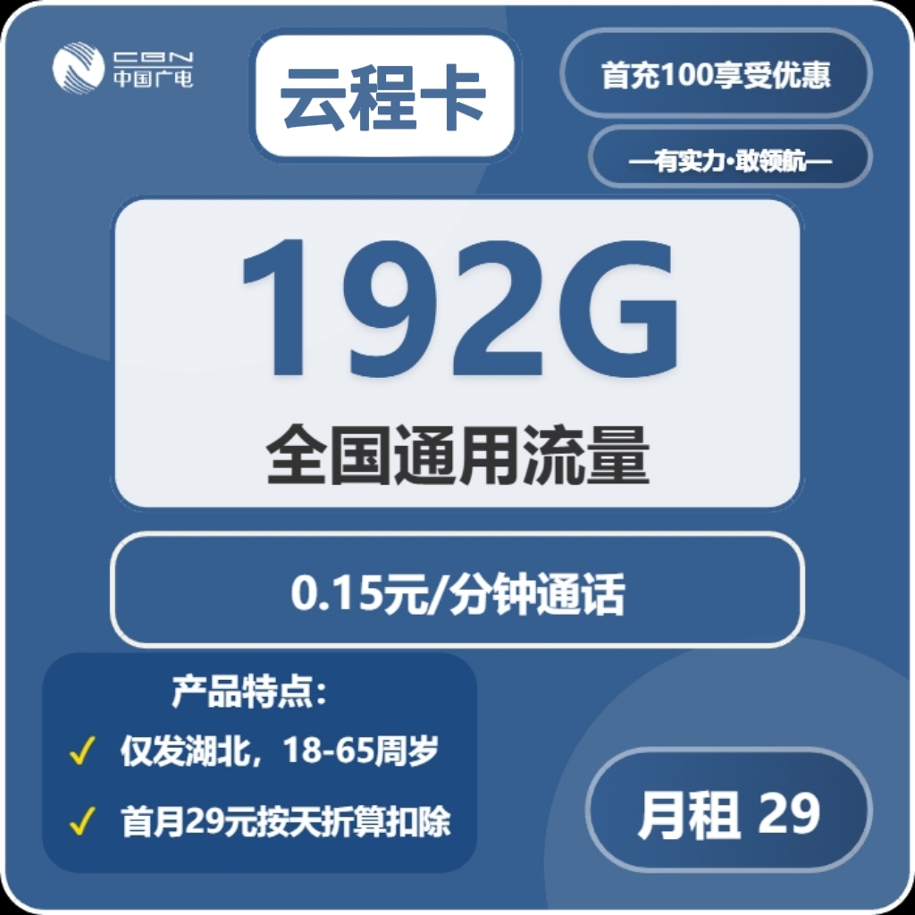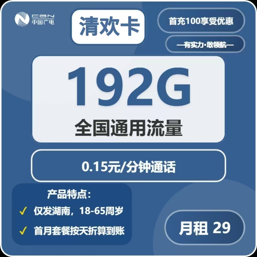 雾雪卡29元包192G通用+通话0.15元/分钟